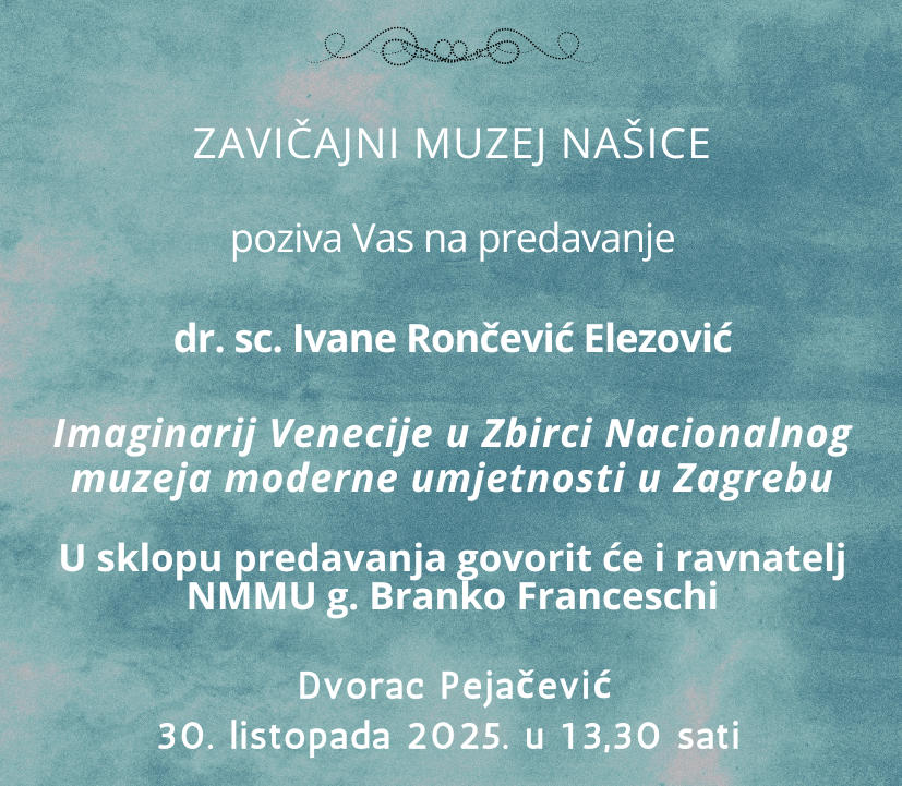 Pozivamo Vas na predavanje dr. sc. Ivane Rončević Elezović na temu “Imaginarij Venecije u Zbirci Nacionalnog muzeja moderne umjetnosti u Zagrebu” koje će se održati u Dvorani Zavičajnog muzeja Našice u četvrtak, 30. listopada s početkom u 13 i 30 sati.