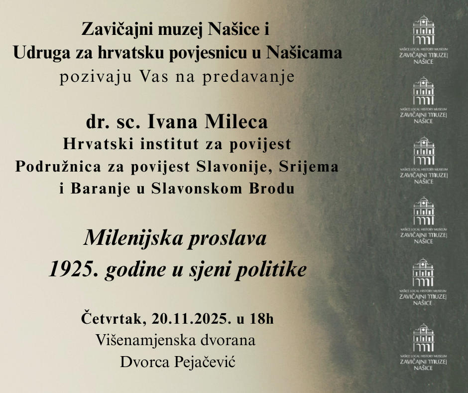 Tema predavanja je Milenijska proslava 1925. godine u sjeni politike, a održat će se u četvrtak, 20.11.2025. godine u Višenamjenskoj dvorani Dvorca Pejačević s početkom u 18,00 sati.