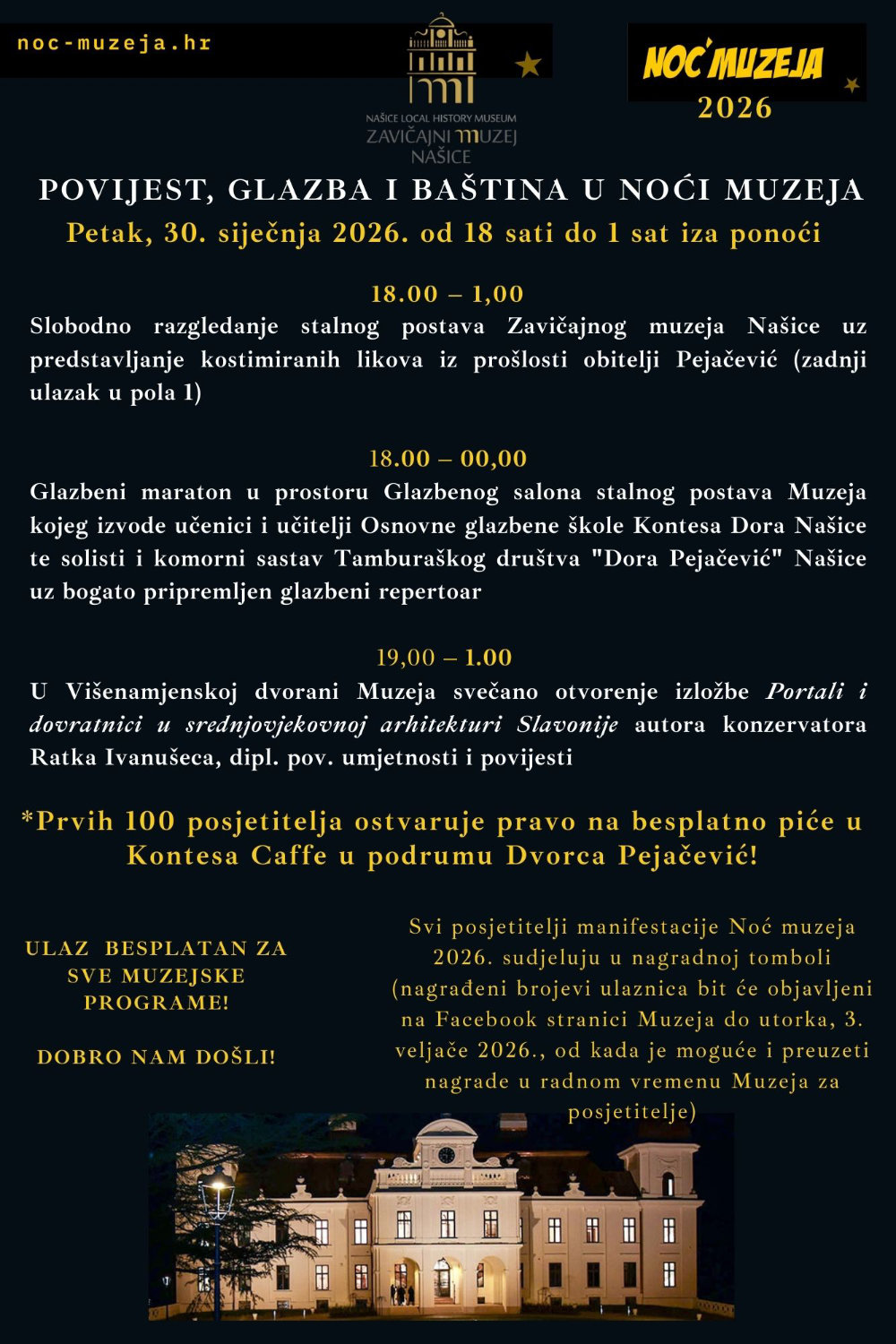Zavičajni muzej Našice poziva vas na 21. Noć muzeja 2026., jedinstvenu kulturnu večer u povijesnom ambijentu Dvorca Pejačević. Očekuje vas bogat i raznolik program koji spaja povijest, glazbu i kulturnu baštinu, uz slobodan ulaz za sve posjetitelje.