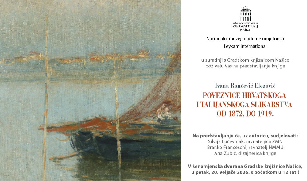 Zavičajni muzej Našice, Nacionalni muzej moderne umjetnosti i Leykam International, u suradnji s Gradska knjižnica Našice, pozivaju vas na predstavljanje knjige dr. sc. Ivane Rončević Elezović Poveznice hrvatskoga i talijanskoga slikarstva od 1872. do 1919.
